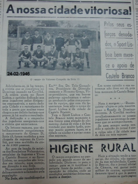 Nos finais de 1936, com a realização do primeiro Campeonato Distrital de Futebol de Castelo Branco a equipa surge com um novo nome, “Sport Lisboa e Castelo Branco”, o qual viria a participar nas primeiras 12 edições do Distrital. Após diversos anos a lutar, a ilustre equipa de Castelo Branco aparece na época de 1947/48 entre as equipas da 2ª Divisão ainda com mesmo nome.