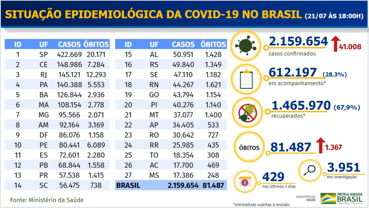 O Brasil contabiliza 2.159.654 milhões de casos da Covid-19. Nas últimas 24 horas foram registradas mais 1.367 mortes, segundo boletim do Ministério da Saúde divulgado nesta terça-feira (21).