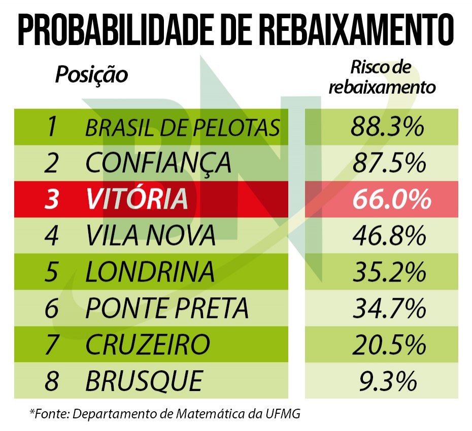 O levantamento aponta que o Brasil de Pelotas é o time que a maior probabilidade de cair (88,3%), seguido pelo Confiança (87,5%), Vitória (66%) e Vila Nova (46,8%).