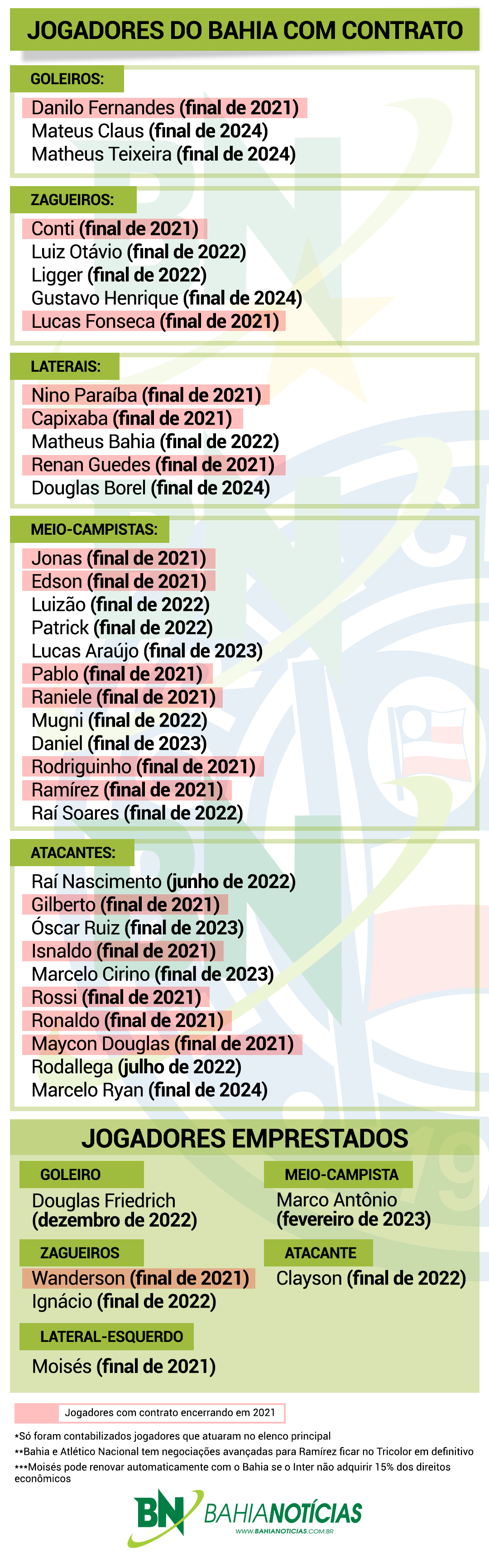 Por outro lado, o atacante Gilberto, principal destaque, tem contrato até o fim deste ano. É o caso de outros jogadores conhecidos do torcedor como o goleiro Danilo Fernandes, o lateral-direito Nino Paraíba e o meia Rodriguinho. Além deles, existe também a situação do meia colombiano Ramírez. Ele está emprestado pelo Atlético Nacional, mas a diretoria baiana tem negociações avançadas para adquirir o atleta em definitivo. Quem também pode voltar para a Cidade Tricolor é o lateral Moisés. O jogador está cedido ao Inter e caso os gaúchos não efetuem a compra de 15% dos direitos econômicos, o contrato com o Bahia é renovado automaticamente.