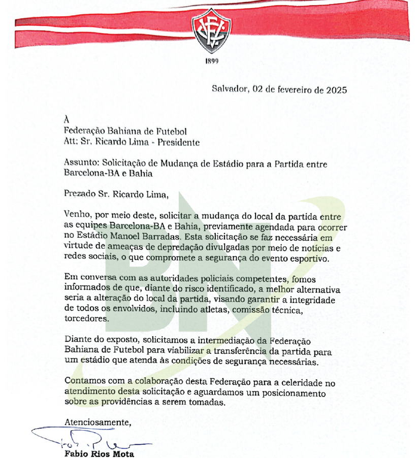 Em contato com a reportagem, o presidente da FBF, Ricardo Lima, afirmou que a Federação encaminhou os pedidos do Vitória para Polícia Militar e a Federação "aguarda a devolutiva". Na última segunda-feira (3), o Bahia Notícias apurou com fontes ligadas ao Barcelona de Ilhéus que houve uma reunião para tratar do assunto e a escolha pelo Barradão estava mantida.