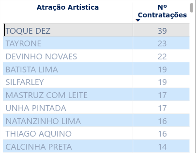 Dos dez artistas mais contratados, três são de forró, Batista Lima, ex-Limão com Mel, aparece em quarto lugar com 19 contratações; Mastruz com Leite fica em sexto lugar com 17; e Calcinha Preta aparece em 10º com 14 contratações.