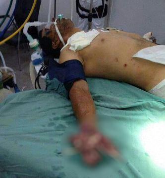 Com a mão dilacerada, o bandido foi deixado para trás pelos comparsas que fugiram e também deixaram uma caminhonete, uma motocicleta e um Uno que ajudava na operação criminosa.