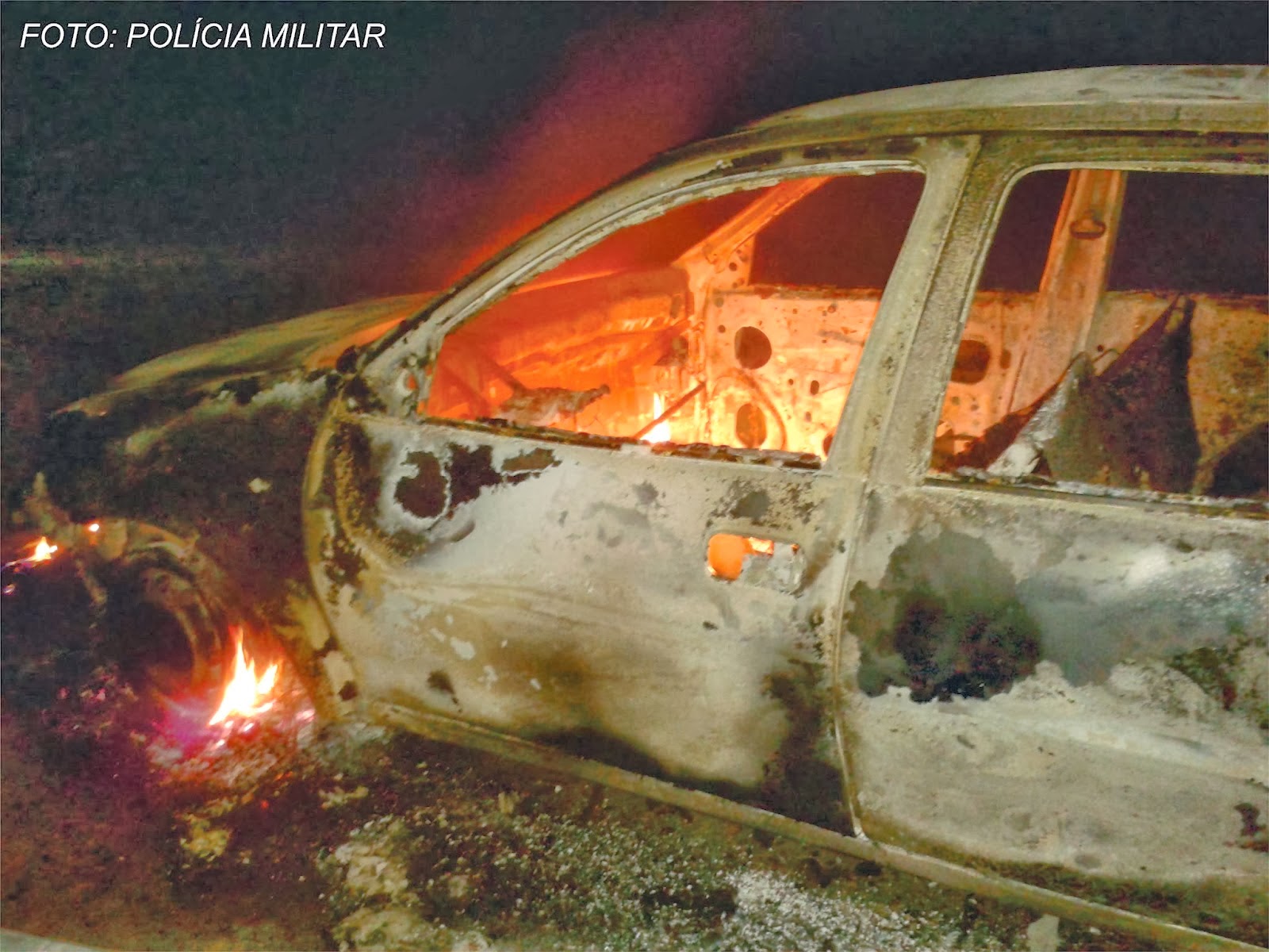 Em rondas pelas redondezas, os policiais militares localizaram um veículo Corsa Classic em chamas na estrada que liga o entroncamento de Anguera a Guaribas, que possivelmente pode ser o veículo utilizado pelos assaltantes.