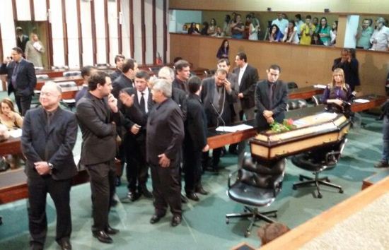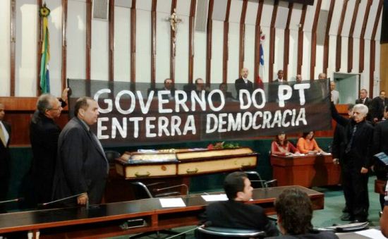 Os parlamentares oposicionistas levaram um caixão para a plenária da Casa, e uma faixa escrita “Governo do PT enterra democracia”, como forma de protesto à fraude que ocorreu na eleição de um dos cargos mais importantes do estado e o afronte a democracia.