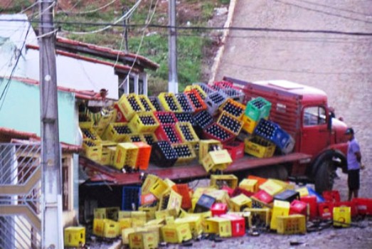 Foram apenas danos materiais. Com o impacto da batida, metade da carga se espalhou pelo chão, deixando uma grande quantidade de garrafas quebradas no local.