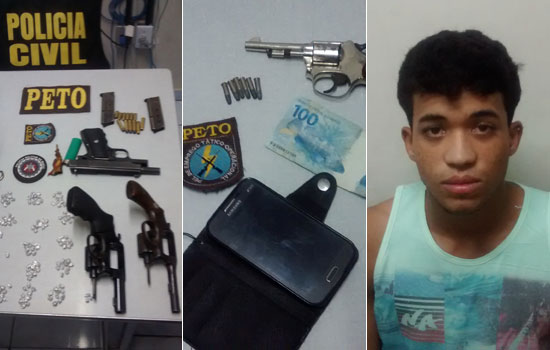 Após uma denúncia anônima os policiais militares retornaram a casa onde as armas e as drogas foram encontradas e ao perceberem uma pessoa que se aproximou da residência flagraram Witney Almeida Araújo, 20 anos, portando um revolver cal. 22 dentro da mochila.