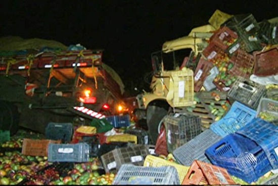Segundo a Polícia Rodoviária Federal (PRF), um caminhão carregado de frutas bateu em outro que estava sendo rebocado por um guincho e, em seguida, atingiu outros dois veículos que estavam parados na pista.