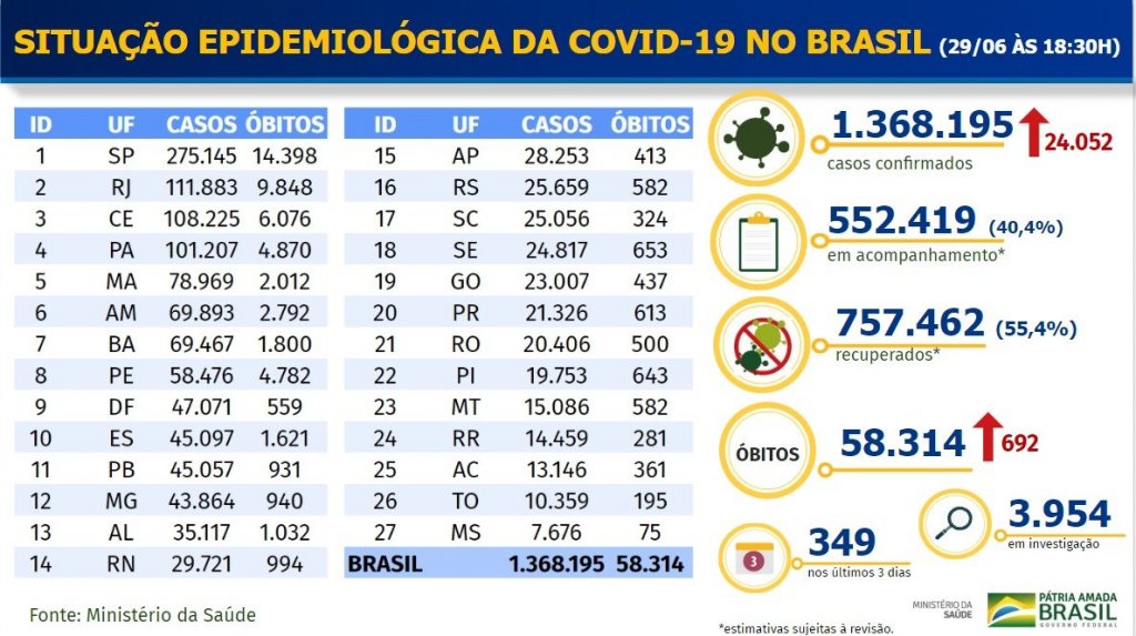 Somente nas últimas 24 horas o Ministério da Saúde informa que foram notificados 24.052 novos casos e 692 novos registros de óbito no país, conforme atualização do sistema da pasta nesta segunda-feira (29).
