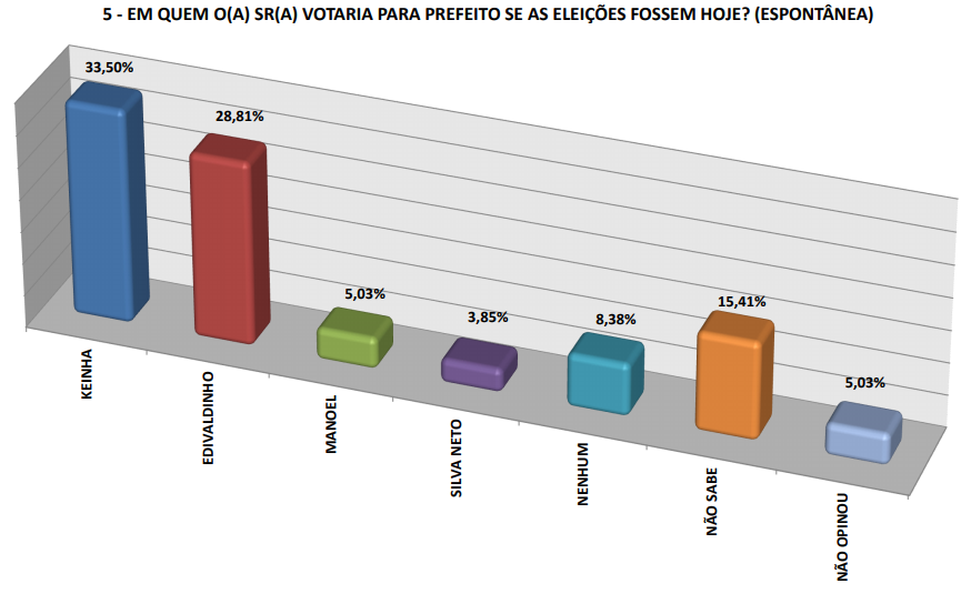 No cenário espontâneo, quando os entrevistados citam o nome que lhes vêm à cabeça, sem indicação prévia, Keinha aparece com 33,50% das citações. Edivaldinho tem 28,81% das menções. Manoel Nunes também foi citado por 5,03% e Silva Neto por 3,85%. Outros 15,41% disseram não saber em quem votar, 8,38% em nenhum e 5,03% não opinaram.