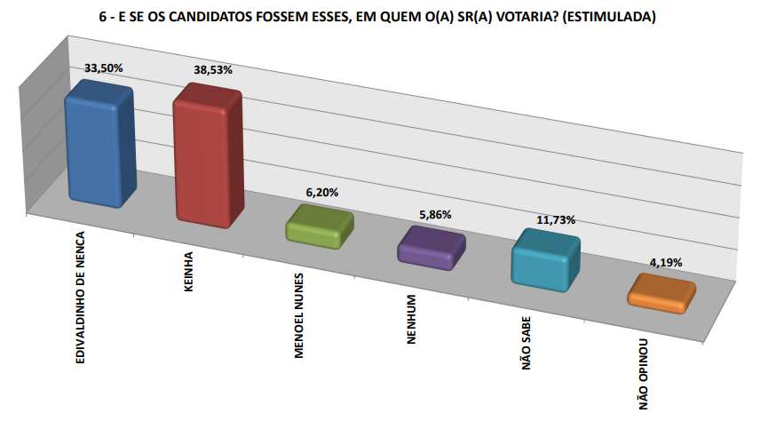 Na pesquisa estimulada, quando o nome dos candidatos no pleito é indicado, Keinha também lidera e tem 38,53% das intenções de voto. Atrás dela, está Edivaldinho, preferido por 33,50% dos eleitores, seguido de Manoel Nunes, que é opção de 6,20% dos entrevistados. Outros 11,73% ainda não sabem em quem votar, 5,86% não pretendem votar em nenhum dos candidatos e 4,19% não opinou.