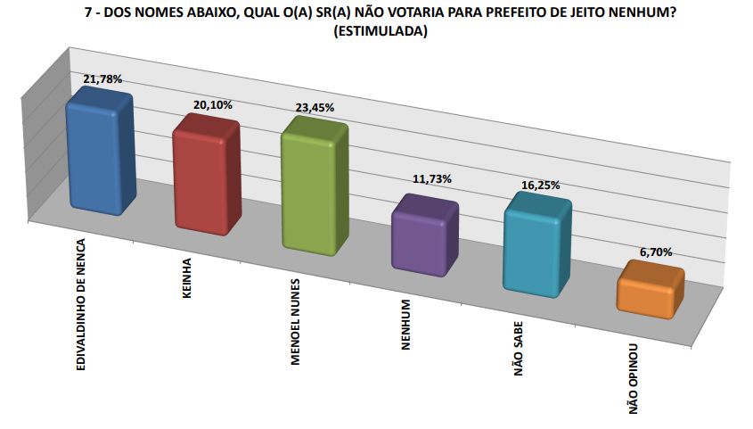 Outra pergunta recorrente durante o período eleitoral aborda o índice de rejeição dos candidatos no pleito. O questionário mostrou Manoel Nunes como o postulante mais rejeitado, citado por 23,45% dos entrevistados como o candidato que eles não votariam de jeito nenhum. Edivaldinho aparece em seguida com 21,78% de rejeição e Keinha tem 20,10%. Neste quesito, 16,25% dos entrevistados não sabem quem rejeitam, 11,73% não rejeitam nenhum dos três e 6,70% não opinaram sobre a questão.