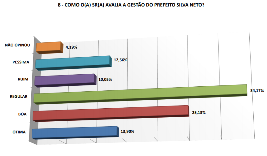 Foi questionado também sobre a gestão do prefeito Silva Neto, que para 34,17%, tem um governo regular. A opção boa vem logo atrás com 25,13%, seguida de ótima com 13,90% é péssima com 12,56%. Ainda opinaram, 10,05% como uma gestão ruim e 4,19% não opinaram.