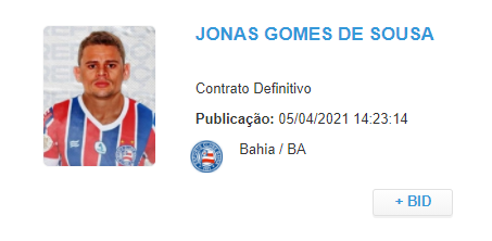 O volante Jonas está liberado para fazer a sua estreia com a camisa do Bahia. Nesta segunda-feira (5), o atleta teve o seu nome publicado no Boletim Informativo Diário (BID) da Confederação Brasileira de Futebol (CBF).