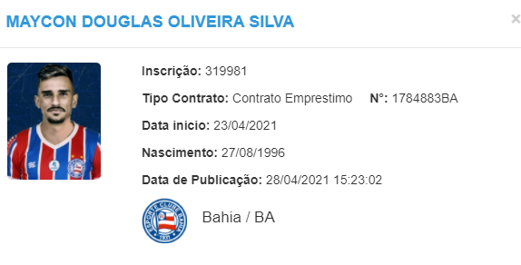 Contratado recentemente pelo Bahia, o atacante Maycon Douglas está regularizado em seu novo clube. Nesta quarta-feira (28), o jogador teve o seu nome publicado no Boletim Informativo Diário (BID) da Confederação Brasileira de Futebol (CBF).