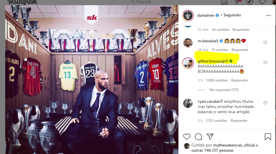 Ativo nas redes sociais, o atacante Gilberto abriu as portas do Bahia para o lateral-direito Daniel Alves, que está sem clube após deixar o São Paulo. Em uma postagem do jogador da Seleção Brasileira, o camisa 9 do Esquadrão de Aço fez um convite para o CT Evaristo de Macedo.